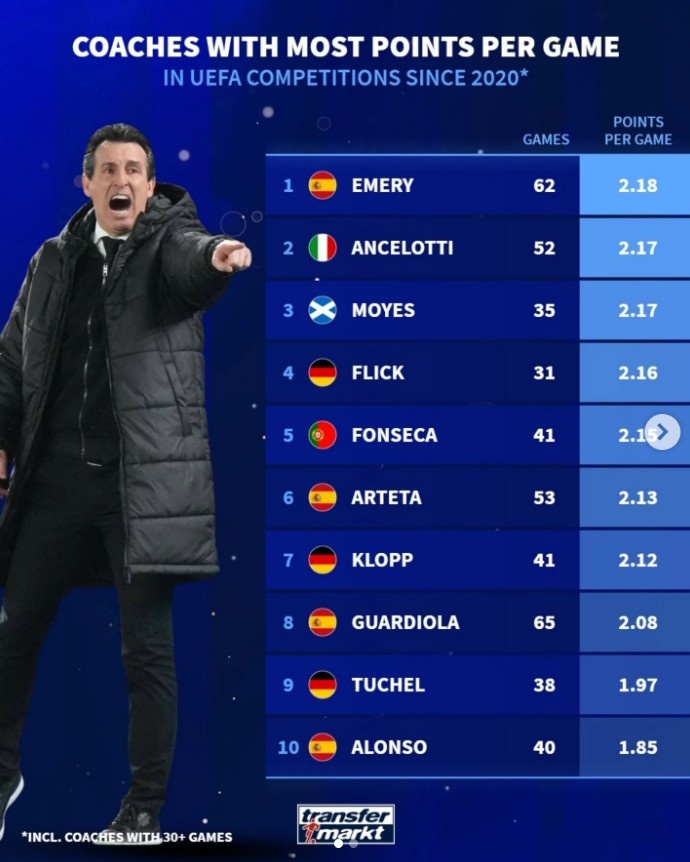 1月23日讯 本赛季维拉在欧联杯表现出色,7战6胜1负,德转也盘点了自2020年以来各位主帅在欧战场均积分榜,其中埃梅里居首,具体如下(至少执教30场比赛):